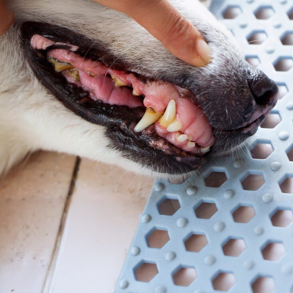 Imaginați-vă un câine de talie mică de 6–7 ani. Stăpânul nu i-a periat niciodată dinții. La o simplă deschidere a gurii se observă: